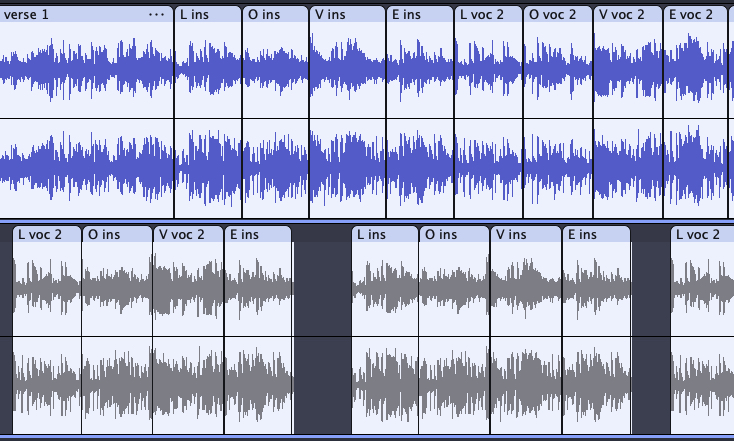 I imported the song into the free, open-source audio editing program Audacity and plugged in a tempo number I found online to give some helpful snap points. I zoomed in on the start of each letter’s section and added a split where I saw the beginning of a spike in the waveform. Once I had each letter, I created multiple tracks to test and fine-tune the start and end times until all the transitions were seamless. The bass guitar ended up being the key to getting things to match, as it was thankfully steady throughout the entire song.