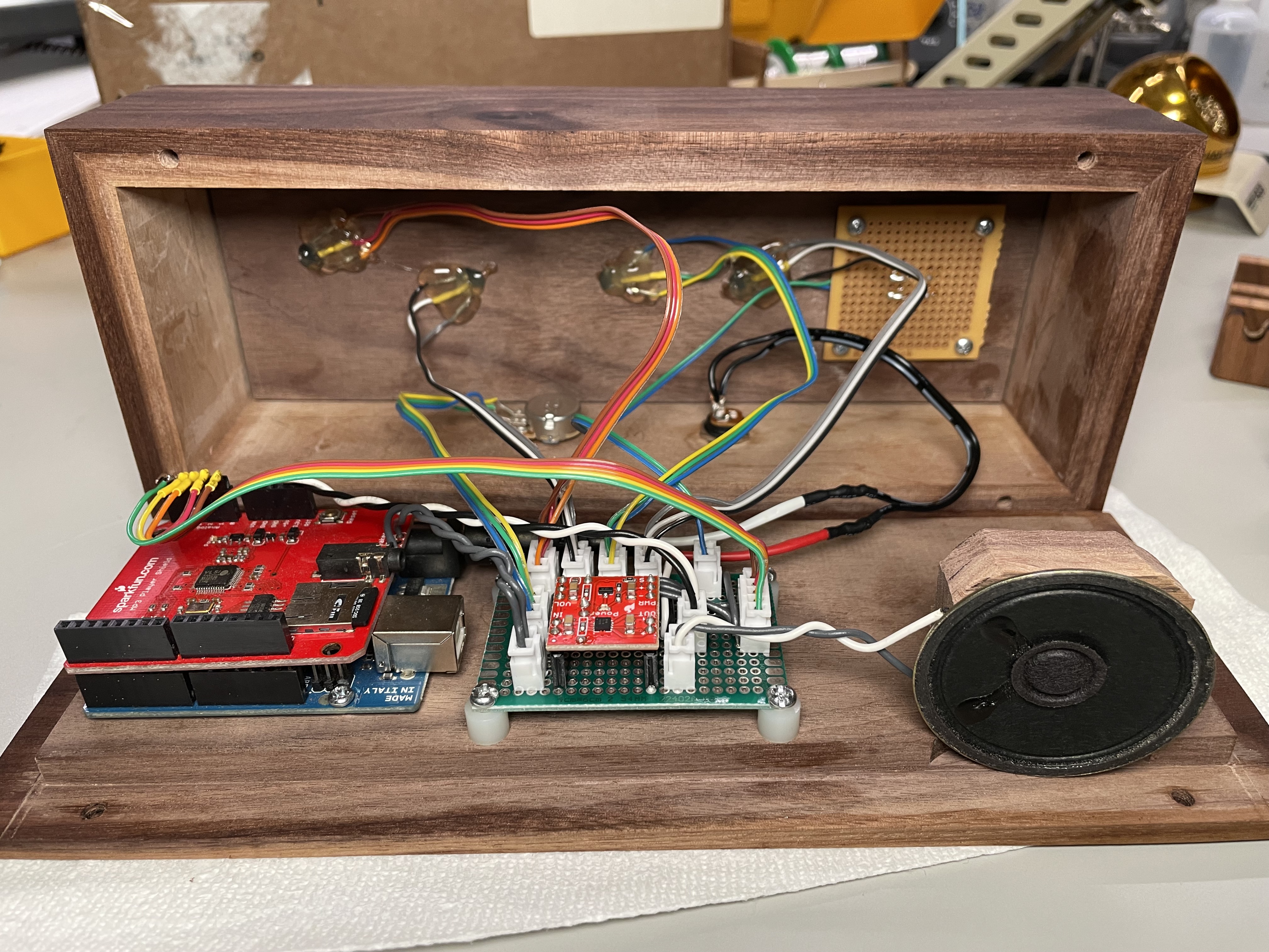For the electronics, I needed a music player which could read the state of the four Hall Effect sensors and play an amplified audio track when the button was pressed. I’ve had a Sparkfun MP3 player shield in my drawer for ages, and realized it was now or never. I’d have loved to use the Adafruit audio FX board, but it can’t handle the input combinations I needed. I had this old mono amp I must have picked up from a garage sale, but unfortunately the grounding schemes do not seem compatible between the MP3 player and the amp. I’m sure there’s some circuitry I could add to interface them, but instead I just grabbed a new amp from Sparkfun. The speaker was another part dug out from the scrap drawer. On the rear side is a DC barrel jack for power and a potentiometer for volume control. The speaker was held in place inside with a wooden bracket.