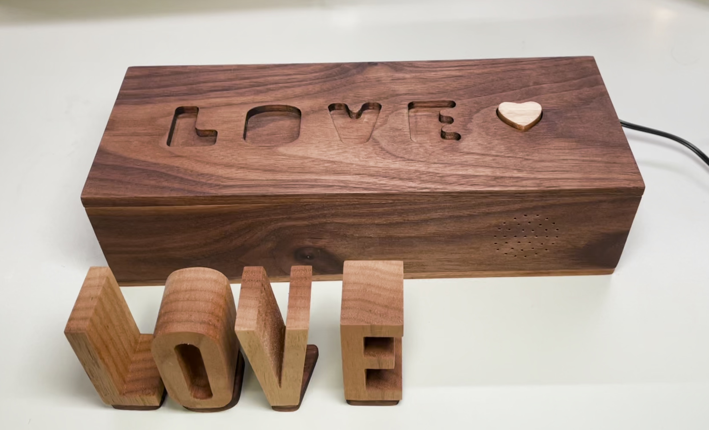 The slots were also cut out with the Shaper Origin, and at the last minute I decided the play button should be heart shaped. To finish the wood I sanded everything fine, wiped it with a damp cloth, then rubbed it with danish oil.