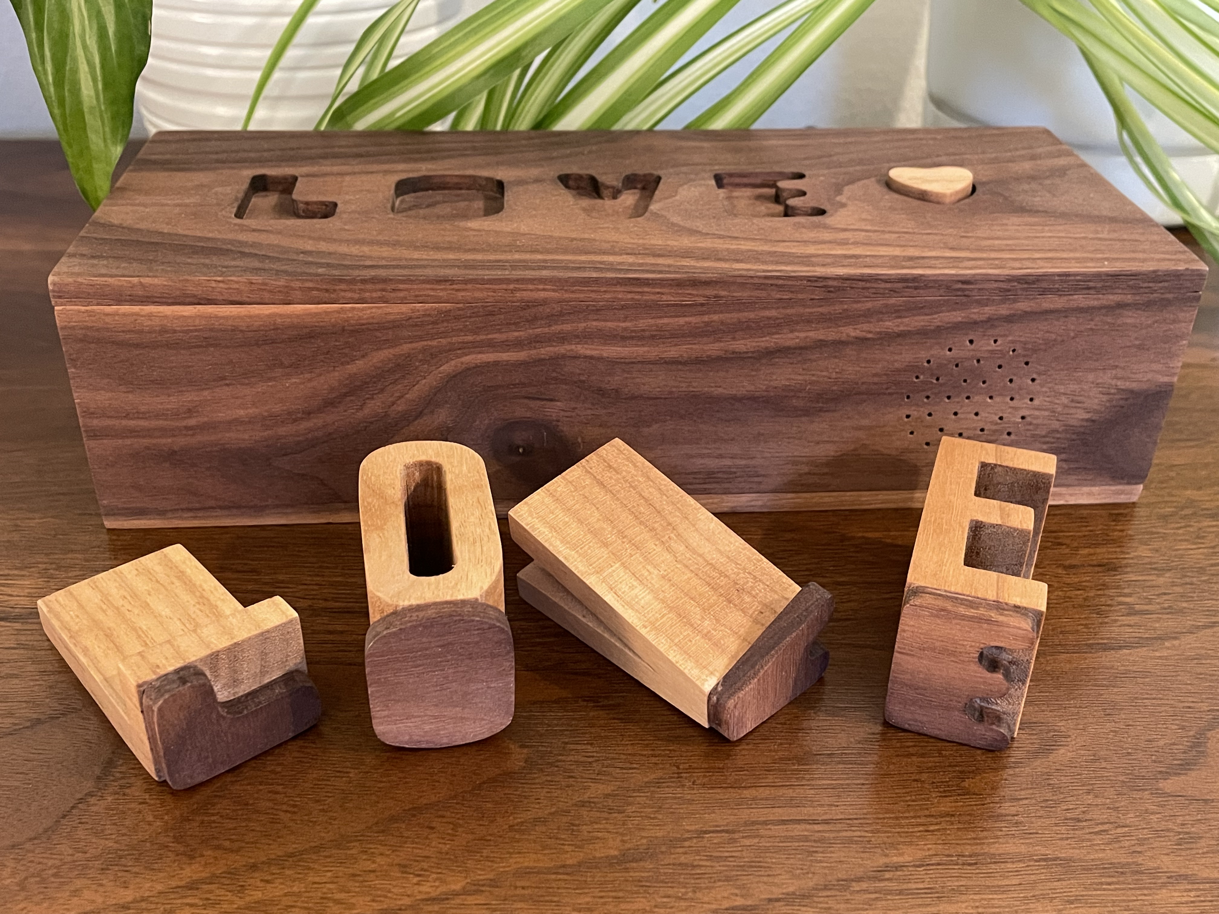 In Nat King Cole’s classic L-O-V-E the two sung verses are separated by an instrumental verse with a trumpet solo. I thought it would be fun to build a music box where each letter’s section could be swapped between the vocal and instrumental renditions.